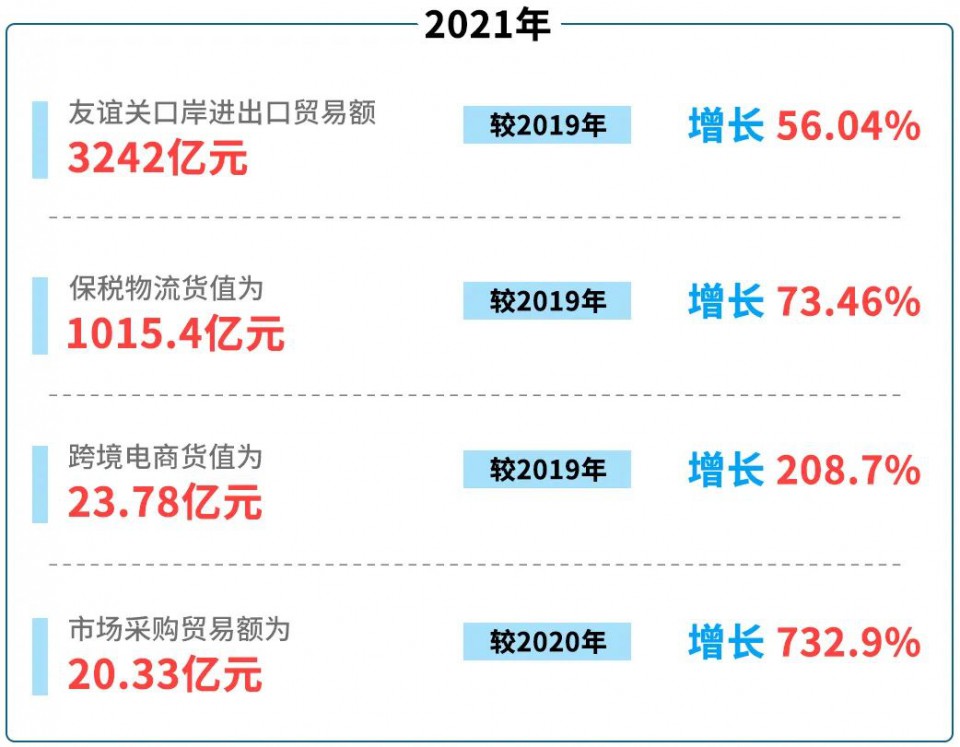 口岸通关条件不断优化:友谊关在全国沿边口岸首个实现“提前申报”“两步申报”并行。保税物流、保税加工、跨境电商业务实现24小时进出综保区。
