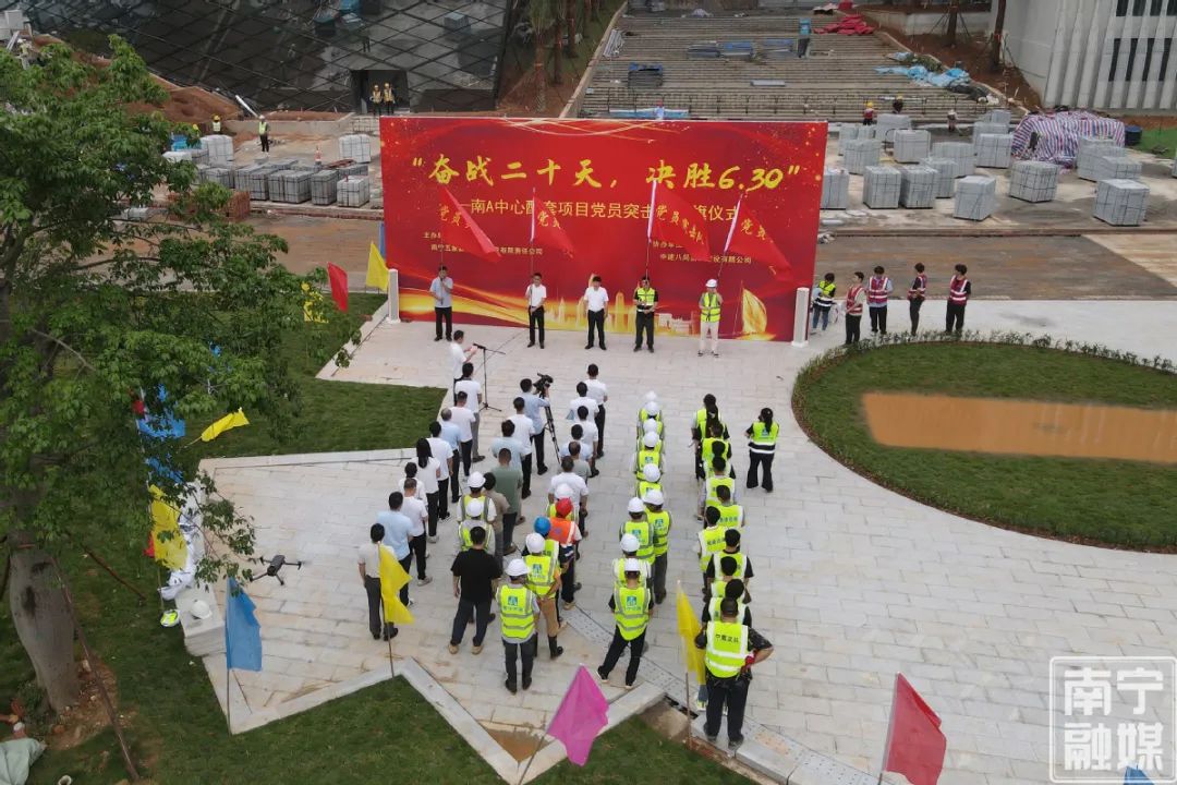 6月10日下午,南A中心配套项目现场举行了“奋战二十天,决胜6.30”党员突击队授旗仪式,项目党员突击队成立。队员们表示,将充分发挥党员先锋模范作用,齐心协力推进项目建设。目前,三个项目共投入管理人员60余名,施工人员超1000人,各类施工机械车辆200余台,全力冲刺既定建设目标。