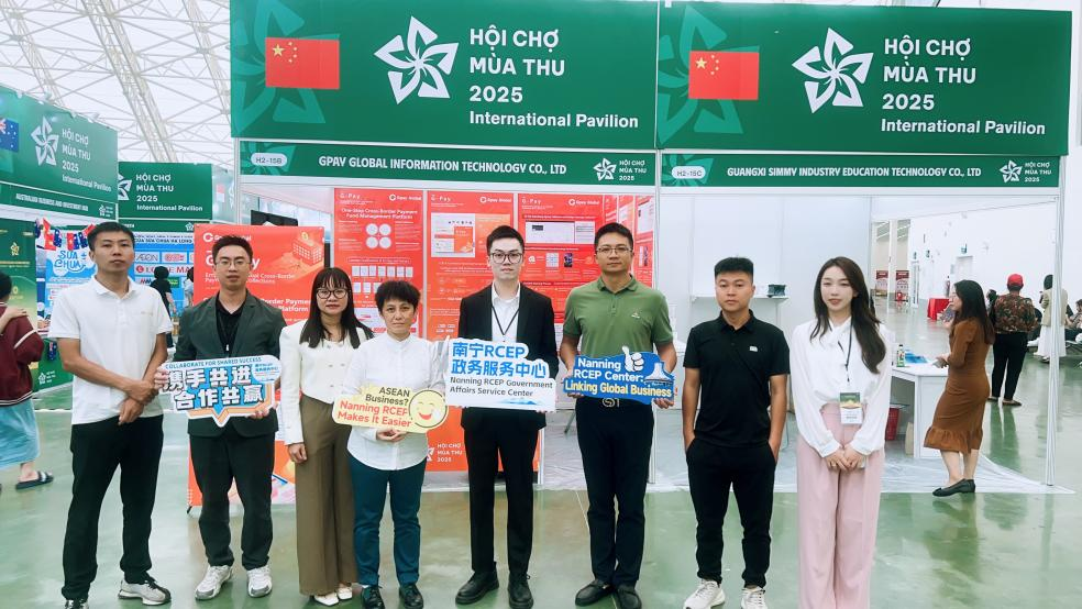 2025年10月25日至11月4日,广西五投国际贸易集团有限公司运营的南宁RCEP政务服务中心组织广西吕洞宾集团、桂付驿生跨境支付平台等5家企业共20人赴越南河内参加2025年越南首届秋季博览会。