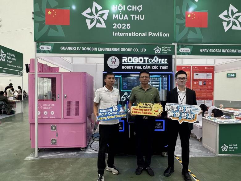 展会上,广西吕洞宾集团展示了融合人工智能技术的AI咖啡机与冰淇淋机,为现场观众带来智慧饮品新体验;桂付驿生跨境支付平台推介一站式跨境资金管理方案,以“T+0到账、手续费低至0.1%”的服务,助力企业有效降低资金周转成本。双方还联合开展RCEP政策解读活动,吸引众多越南企业驻足交流洽谈。