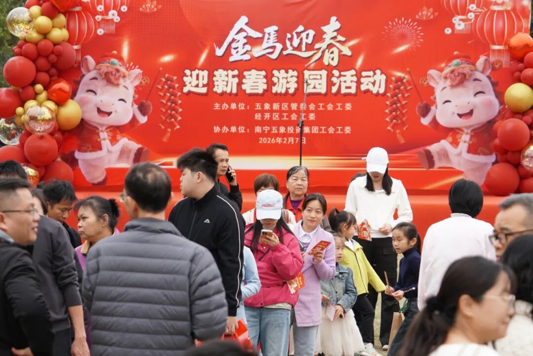 2026年新春佳节将至,为丰富干部职工的精神文化生活,增强向心力和凝聚力,以昂扬向上的精神状态迎接新一年的到来,2月7日,由五象新区管委会工会工委、经开区工会工委联合主办,五象投资集团工会协办的2026年迎新春游园活动在五象新区总部基地休闲公园拉开序幕,来自机关、辖区企事业单位工会会员代表共1300余人参加活动。
