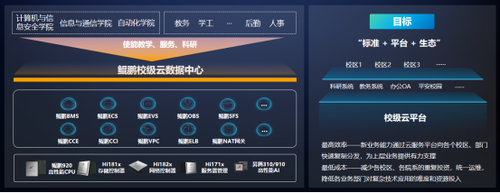 依托华为智能云的解决方案和数广宝德鲲鹏服务器提供的云计算节点,桂电云数据中心建成高校混合云,打造“产、学、研”的云智能中枢,依托云底座打造数据湖,消除数据孤岛,解决了信息化建设统筹不足、ICT基础设施支撑乏力、业务与服务无法联动调用以及数据缺乏统一标准的难题。