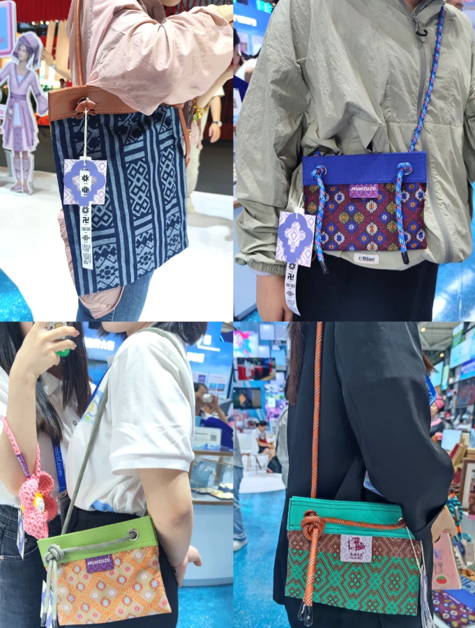 木棉远山此次主要展示的是壮锦织物产品,其中以女士手袋为主打。主理人农舒婷表示,非遗壮锦是广西的特色,工作室专注于传统壮族织锦产品的研发,包括传统织锦花纹的采集与设计,目标是通过创新的产品,让传统的壮锦织物被现代人所了解,并融入到日常生活中。此次参展,除了让人们更多地了解壮锦文化,更重要的是测试产品的市场反馈,并借此机会学习交流。
