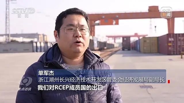 浙江湖州长兴经济技术开发区管委会经济发展局副局长 单军杰:在RCEP政策红利下,我们对RCEP成员国的出口呈现出递增趋势,2024年1月到10月,长兴对RCEP成员国出口额同比上涨15.3%。目前我们周边也辐射了安吉、广德、宜兴、常州等长三角一些地区,目前长兴“铁公水”多式联运中心已成为长三角重要的物流集散中心。