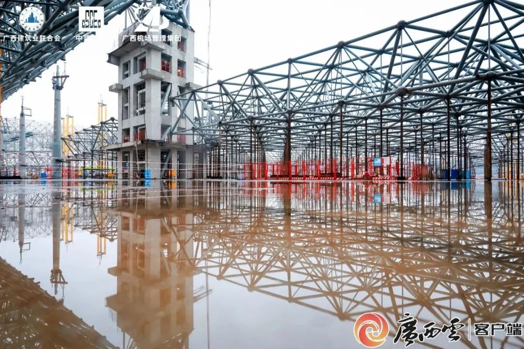 雨中的南宁吴圩国际机场T3航站楼二标段项目建设现场,地面上的雨水倒映出航站楼的钢屋盖。