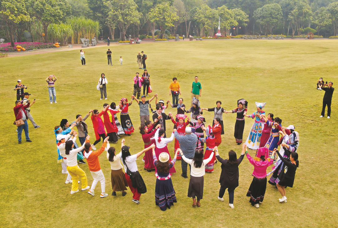 以舞传情、以步连心。在青山绿水间,来自五湖四海的游客纷纷参与活动,共跳民族团结之舞,在动人旋律中感受民族情深。不同的语言汇成同一句祝福,不同的服饰织就同一幅画卷——中华民族一家亲,石榴花开美邕城!