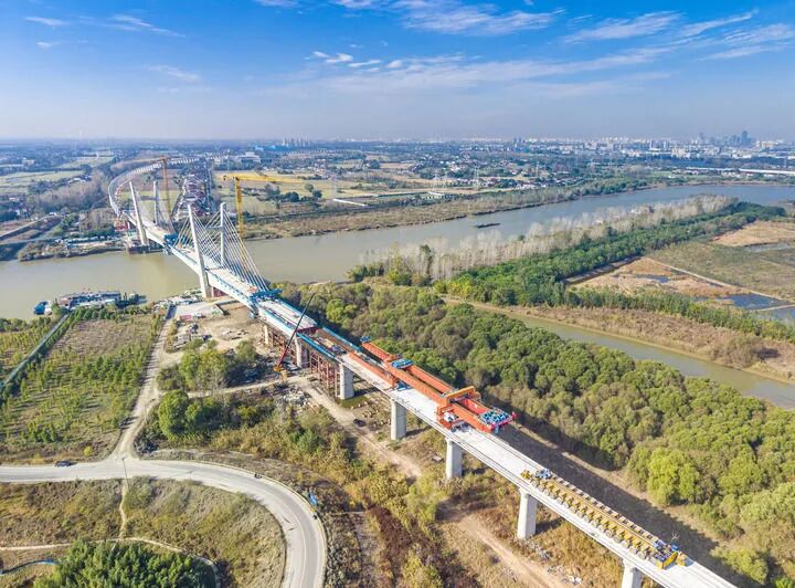 2025年11月20日,中铁建大桥局施工机械在沪渝蓉高铁江都段最后一榀箱梁架设现场作业(无人机照片)。(任飞摄)