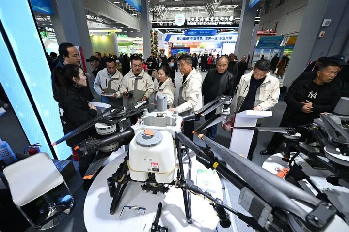 2025年10月25日,参观者在杨凌农高会上了解大疆农业无人机。记者 李一博 摄