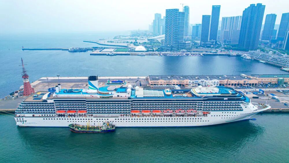 2025年5月27日拍摄的停靠在大连港国际邮轮中心泊位的“爱达·地中海”号(无人机照片)。记者 潘昱龙 摄