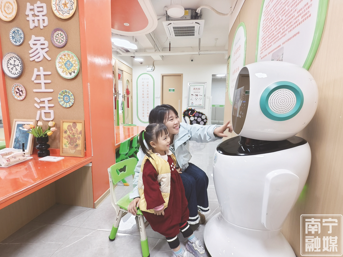 “小老鼠,上灯台,偷油吃,下不来……”近日,在位于青秀区银杉社区江宇都会明珠小区的锦象小爱托育园内,清脆的童声伴随早教机器人的音乐响起,孩子们在老师带领下做手指操,小脸上满是专注。