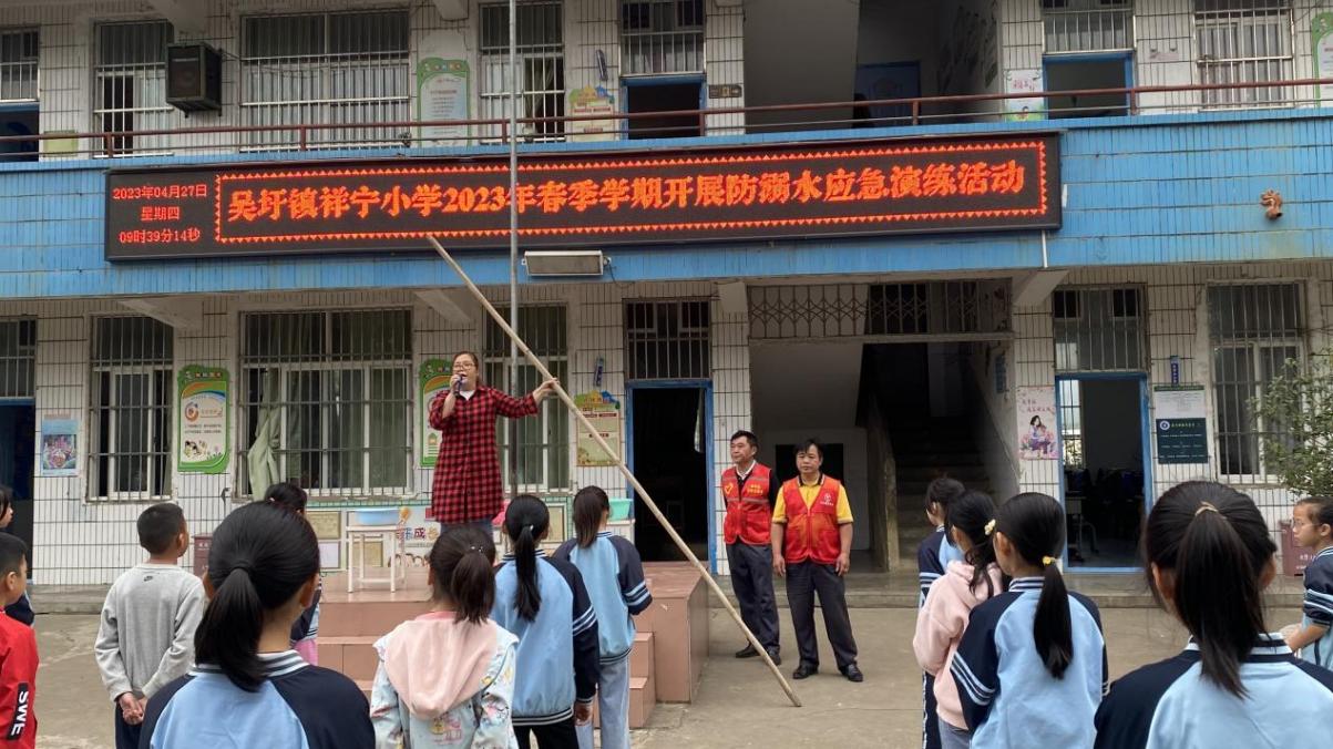 祥宁小学教师正在展示施救工具、讲解防溺水的重要性