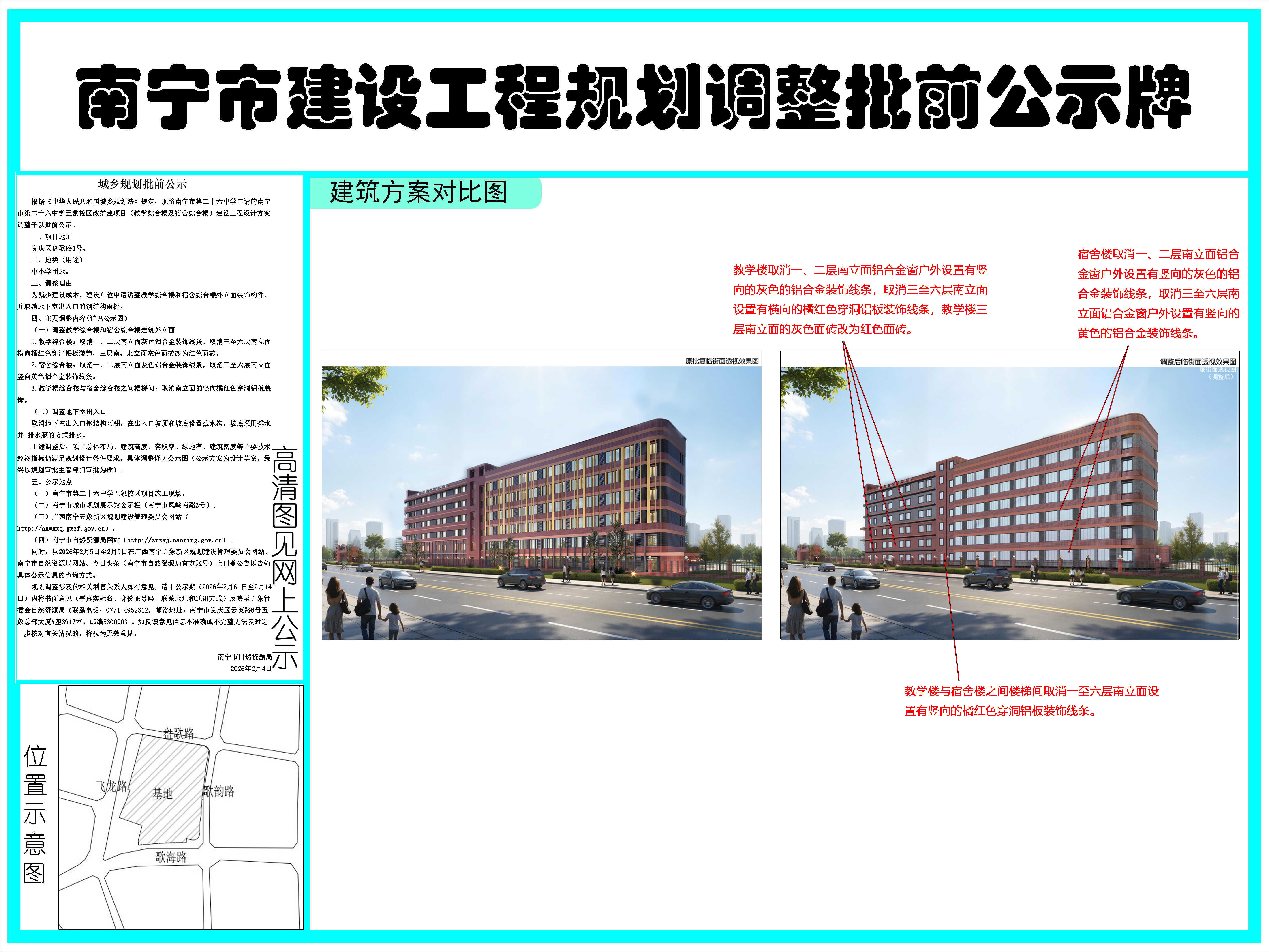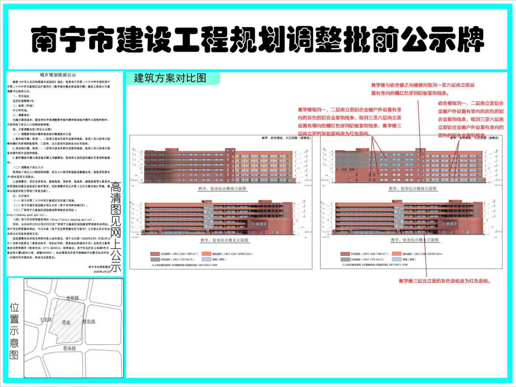 根据《中华人民共和国城乡规划法》规定,现将南宁市第二十六中学申请的南宁市第二十六中学五象校区改扩建项目(教学综合楼及宿舍综合楼)建设工程设计方案调整予以批前公示。