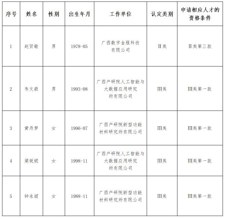 根据《自治区党委组织部等四部门印发<关于促进中国(广西)自由贸易试验区人才集聚的若干措施>的通知》(桂组通字﹝2021﹞144号)及《中国(广西)自由贸易试验区南宁片区急需紧缺人才认定办法(试行)》(南自贸管委发﹝2022﹞3号)有关规定,经过个人申请、单位推荐、材料核验等程序,现将赵贤敬等符合条件的5位人员(详见附件)予以公示,公示期7天(2022年10月14日-2022年10月20日)。公示期间,如对公示内容有异议,请及时以书面形式向五象新区(自贸试验区南宁片区)人才工作领导小组办公室反映,并署真实姓名和联系方式,于2022年10月20日前通过传真、邮寄或直接送达等方式报送至五象新区管委会,过期不予受理。