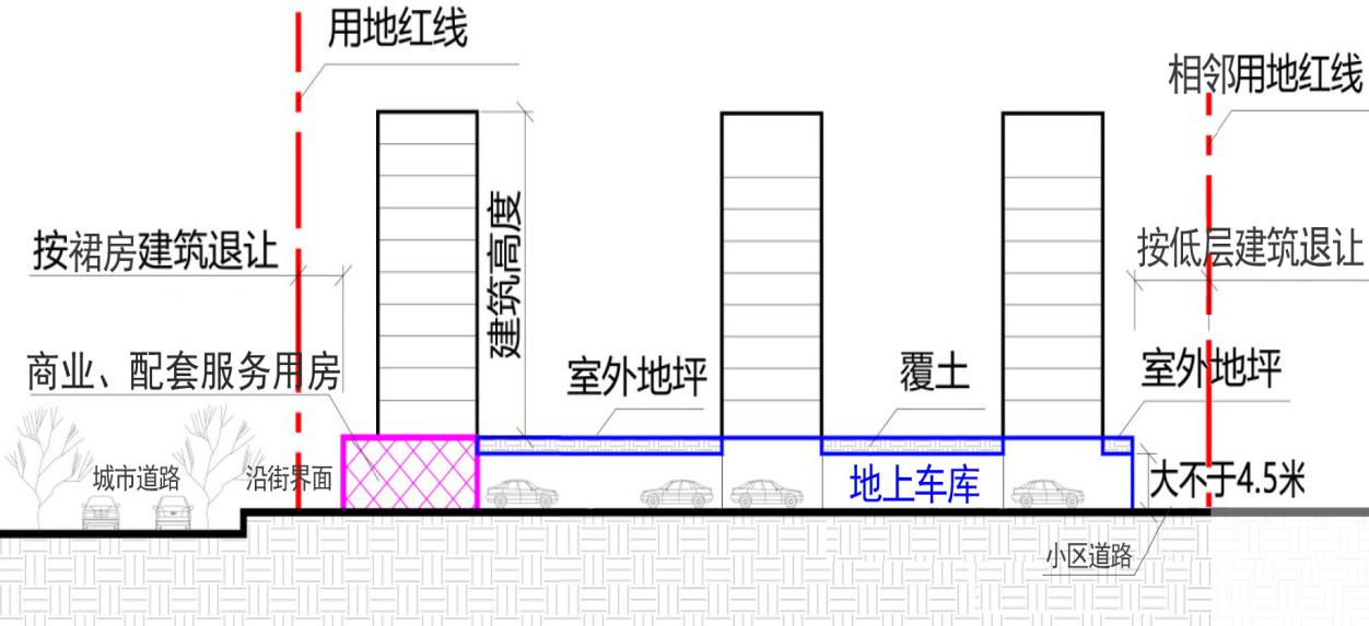 4.支持居住小区整体建设地上停车库。在满足项目合理交通组织的前提下,支持结合场地整体建设单层结构层高不大于4.5米的地上停车库,以停车库顶面平台作为室外地坪计算该项目的绿地面积以及对应楼栋的建筑占地面积、建筑层数、建筑高度(有特殊高度控制区域除外);顶面平台应与小区景观一体化设计,停车库沿街界面一侧应设置商业及配套服务用房进行封闭,局部未封闭的临街外立面应结合主体建筑风貌及环境景观效果做一体化设计。满足以上要求的地上停车库空间可不纳入容积率计算。(附图1)