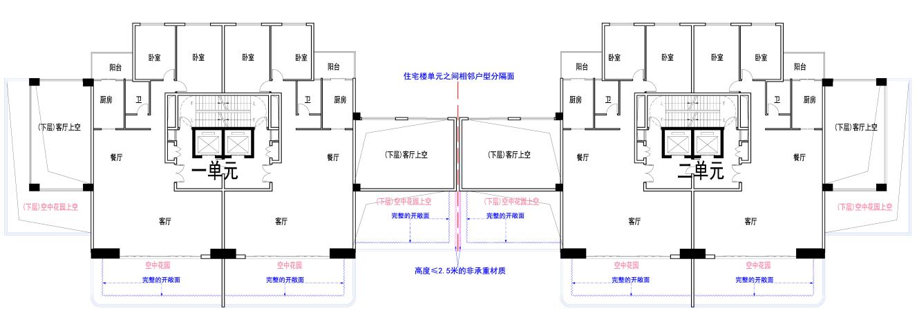 11.优化户内空中花园开敞面设计规则。户内空中花园四周应不少于2个完整的开敞面,且开敞面总长不少于空中花园周长的40%,不设结构柱、装饰柱、剪力墙等,不可外接连梁、板、雨篷等构件。对于住宅楼单元之间相邻户型的户内空中花园如相连的,为保障住户隐私,可采用高度≤2.5米的非承重材质进行分隔,该分隔处可视为开敞面。(附图5)