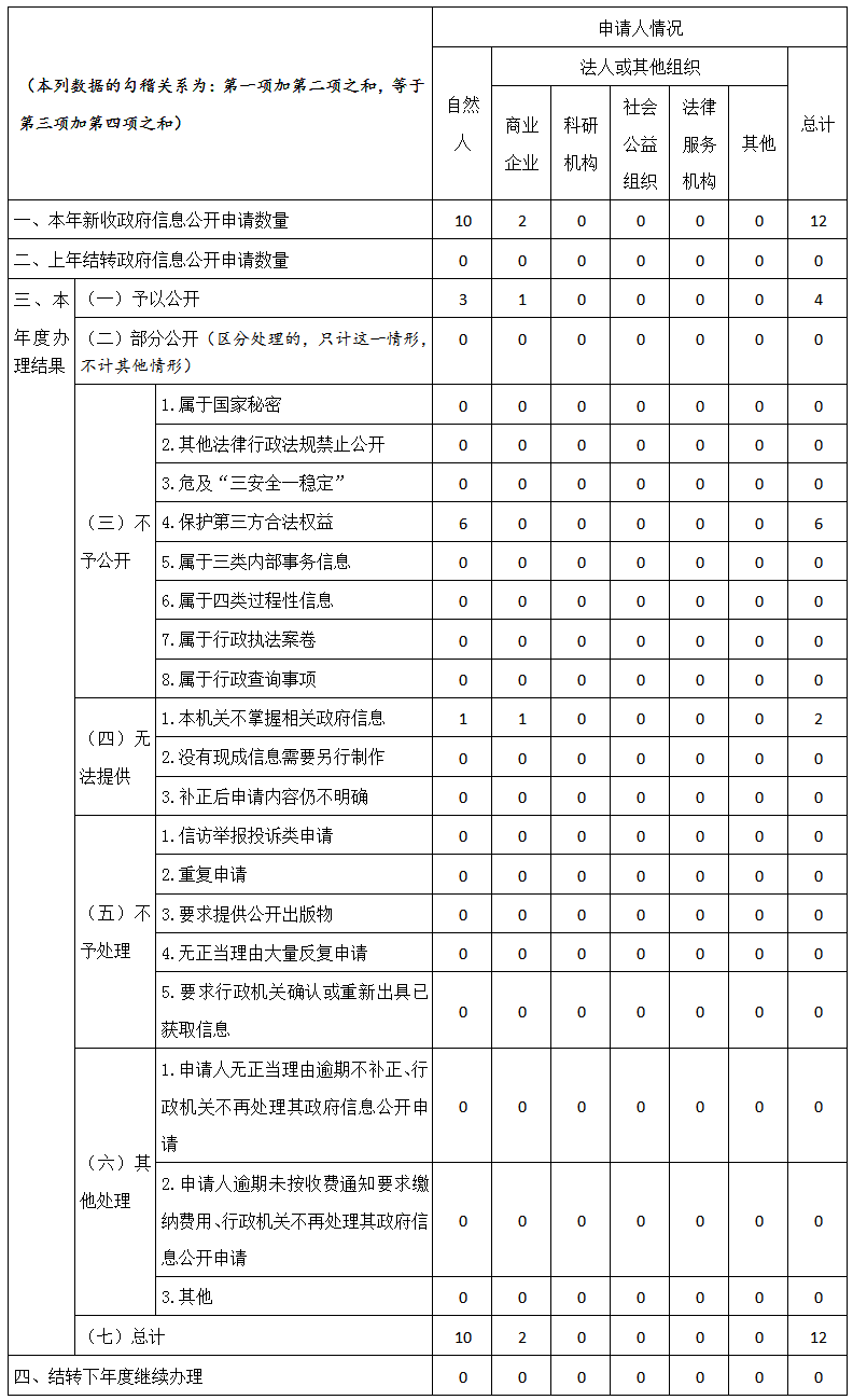 2021年收到政府信息公开申请12件。经审查,同意公开答复数4件,本机关不掌握相关政府信息的2 件,其他处理的6件。经开区暂无因政府信息公开申请提起行政复议或行政诉讼的情况。